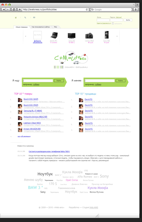 Commuto.ru, a также Komu-to.ru, Lotsofthings.ru, InExchange.ru, Vobmene.ru и isbavsya.ru - серия сайтов, посвященных обмену ненужных вещей. Задача: сделать дизайн поисковой системы. Дизайн Татьяна Avaloness